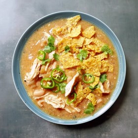 lightly crush 4 tortilla chips over each bowl and top evenly with the cilantro and jalapeño.